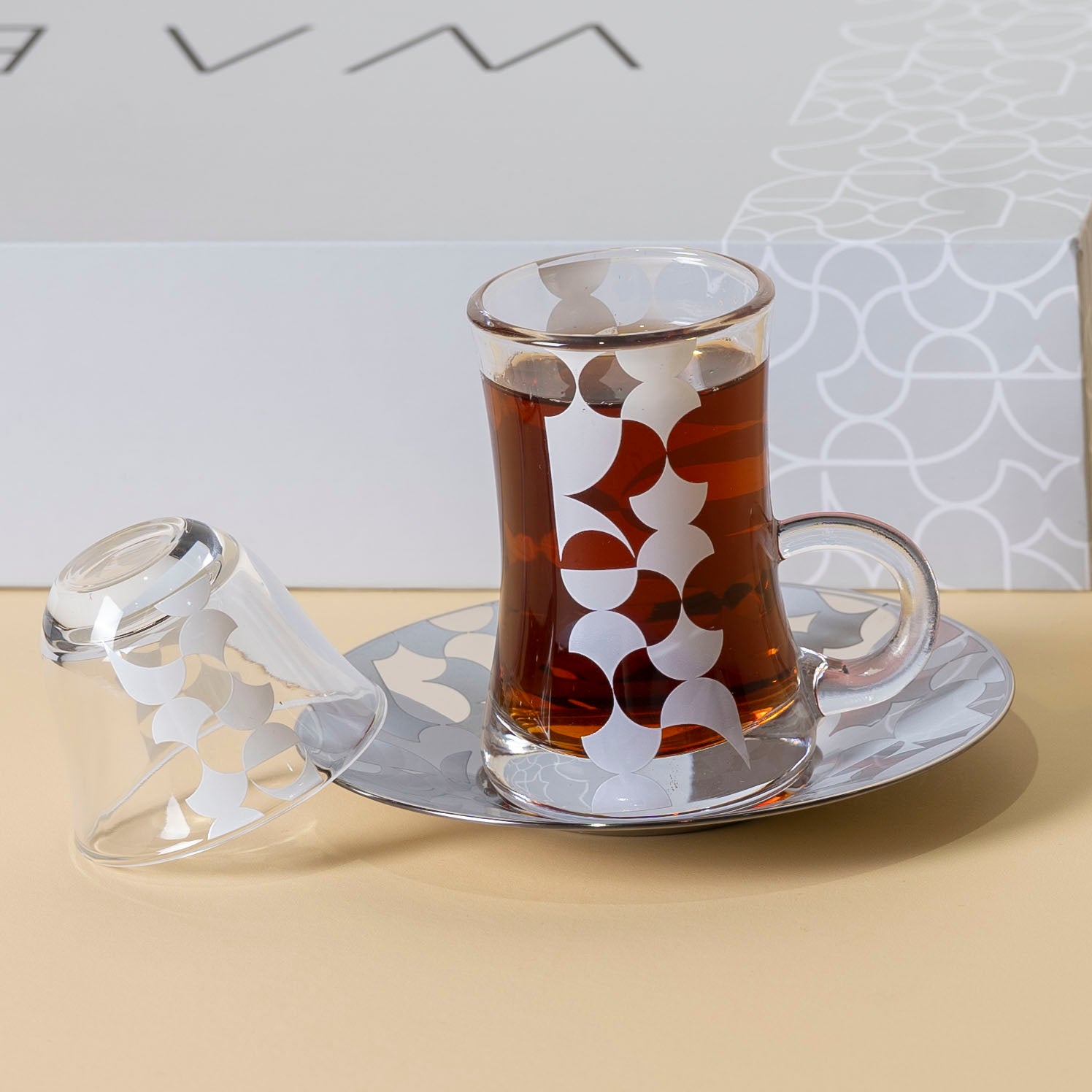 طقم استكانات شاي أنيق مصنوع من الزجاج الشفاف، مزين بنقوش جذابة تضفي لمسة راقية