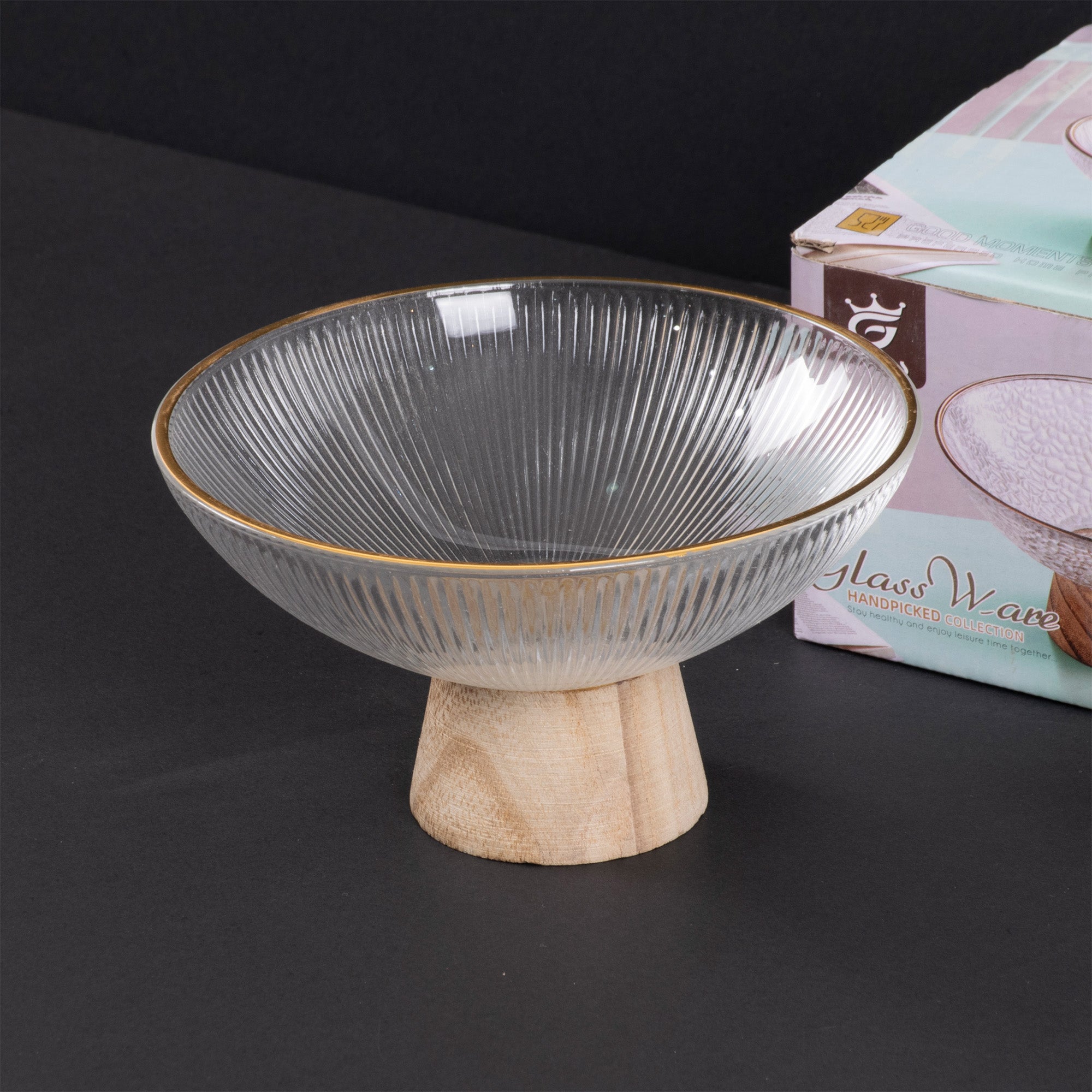 صحن التقديم الزجاجي المصمم بقاعدة خشبية متينة. يتميز الوعاء بتصميم شفاف مخطط بحواف ذهبية أنيقة , مثالي لهواة الديكور الأنيق وأصحاب الذوق الرفيع